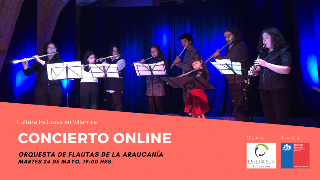 Este es el tercer concierto en línea que presenta Fundación Esfera Sur, que forma parte del programa Cultura Inclusiva en Villarrica. En esta ocasión, contaremos con un concierto que brindará el Ensamble de Flautas de La Araucanía, dirigido especialmente a los beneficiarios directos del programa y abierto también a toda la comunidad de manera gratuita y online por medio de las plataformas de Facebook de Fundación Esfera Sur o en el link https://fb.me/e/oBYq1T5IY.
