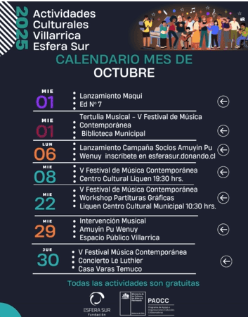 ¡Octubre llegó cargado de panoramas culturales a Villarrica! La Fundación Esfera Sur ha preparado un calendario lleno de música, creatividad y encuentros para toda la comunidad. Revisa lo que ya vivimos y prepárate para las emocionantes actividades que aún quedan este mes. Recuerda, ¡todas las actividades son gratuitas!